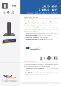 The 275/M30 1200 A high-security automatic bollard is designed to maximise visibility thanks to its impressive height. The model features triple certification (PAS68, IWA 13 and ASTM M30 at 50 Km/h) and offers superior breakthrough resistance, up to 1,200,000 J, equivalent to an M40 level. This model is also available with an extractable pump to simplify maintenance.